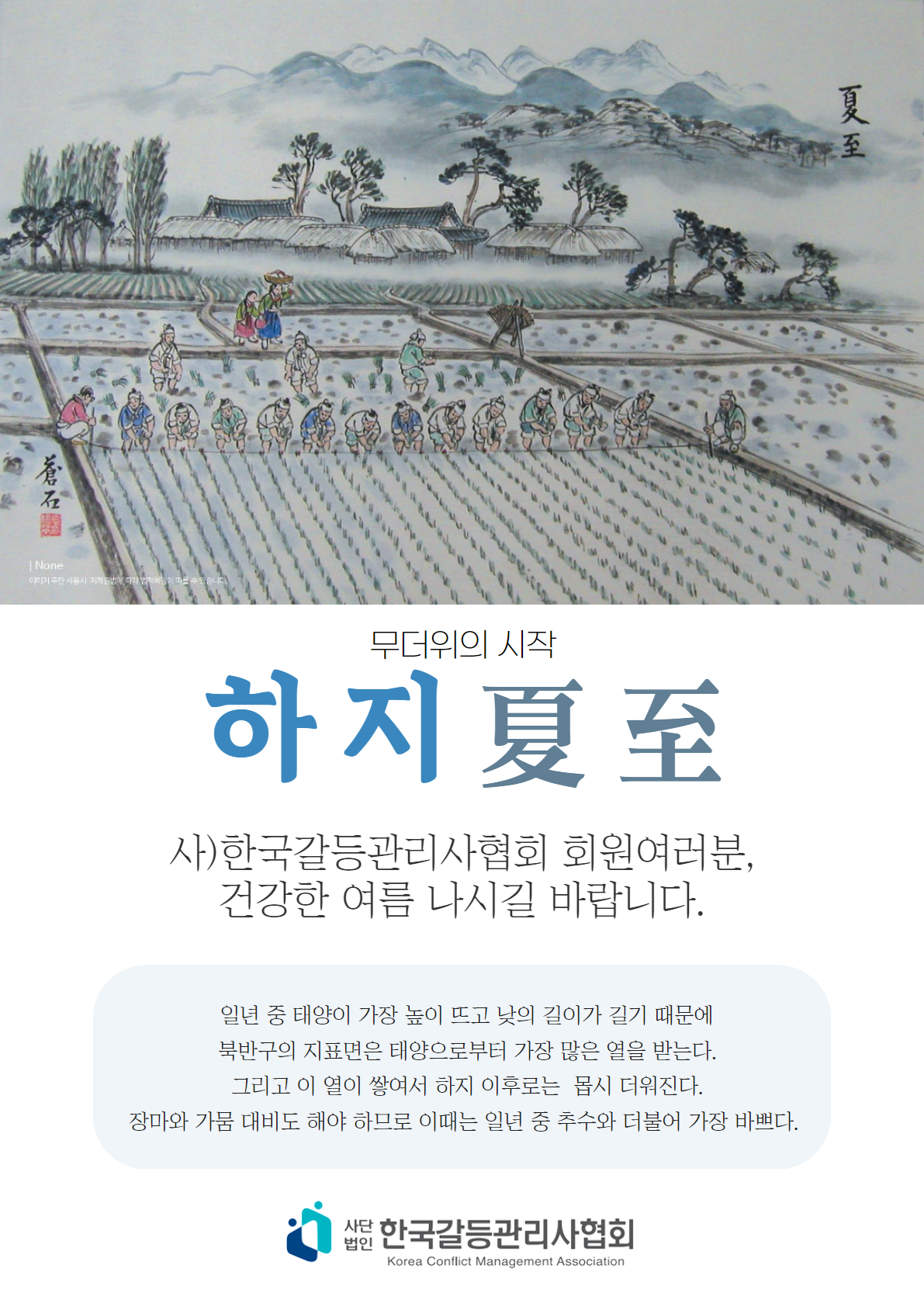 2024년 하지 인사 작성자 관리자 작성일 2024-06-20 04:38 조회 216 #하지 #무더위 #건강 #사)한국갈등관리사협회안녕하세요! 사)한국갈등관리사협회 사무국입니다.내일은 무더위의 시작인 하지입니다.회원 여러분~ 건강한 여름 보내시길 바랍니다^^ 좋아요 0 싫어요 0 인쇄 « 2024 한국갈등학회 창립 10주년 하계공동학술대회 참가 안내 2024 한국갈등학회 창립 10주년 하계공동학술대회 일정 안내 » 목록보기 답글쓰기 Powered by KBoard