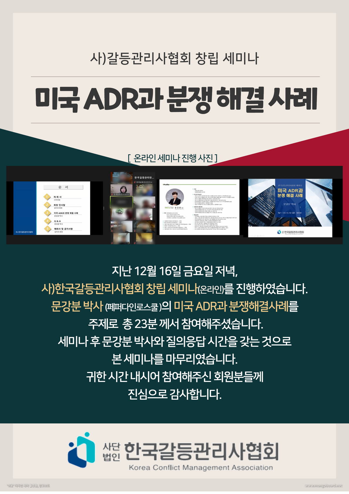 창립 세미나 개최 작성자 관리자 작성일 2022-12-21 02:52 조회 204 좋아요 0 싫어요 0 인쇄 « 【News Letter NO.5】 12월 한국갈등관리사협회 소식지 제2회 총회 개최 » 목록보기 답글쓰기 Powered by KBoard