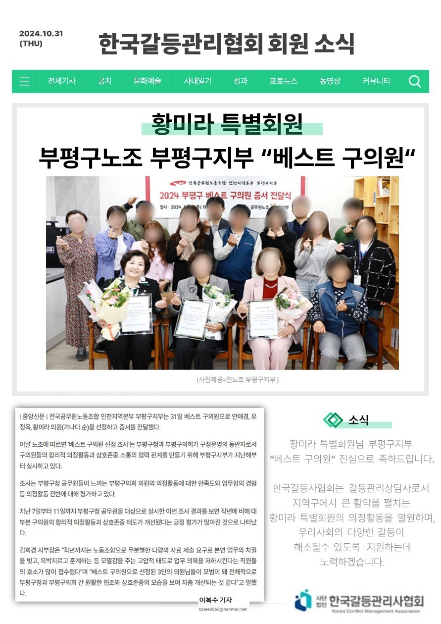 안녕하세요, 한국갈등관리협회 사무국입니다.황미라 특별회원님께서 공무원노조 부평구지부 "베스트 구의원"에 선정되셨습니다.진심으로 축하드리며 구의원으로 활약중이신 황미라 회원님을 응원하며 앞으로도 많은 활동 부탁드립니다 ^^